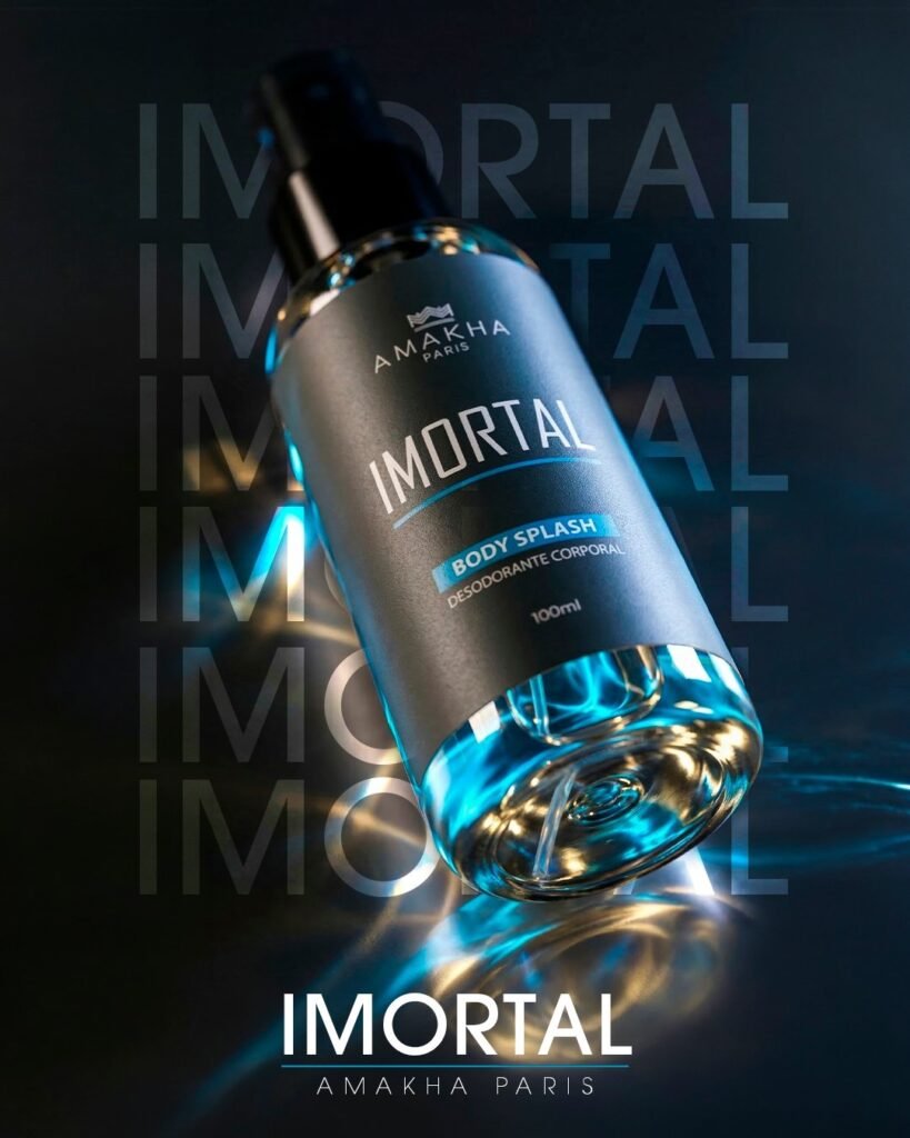 Oferece alta projeção e fixação para uso noturno. Em seguida, o Body Splash Imortal, de 100ml, é amadeirado aquático. Combina notas oceânicas, toranja, lavanda, jasmim, âmbar cinzento e madeira guaiac.