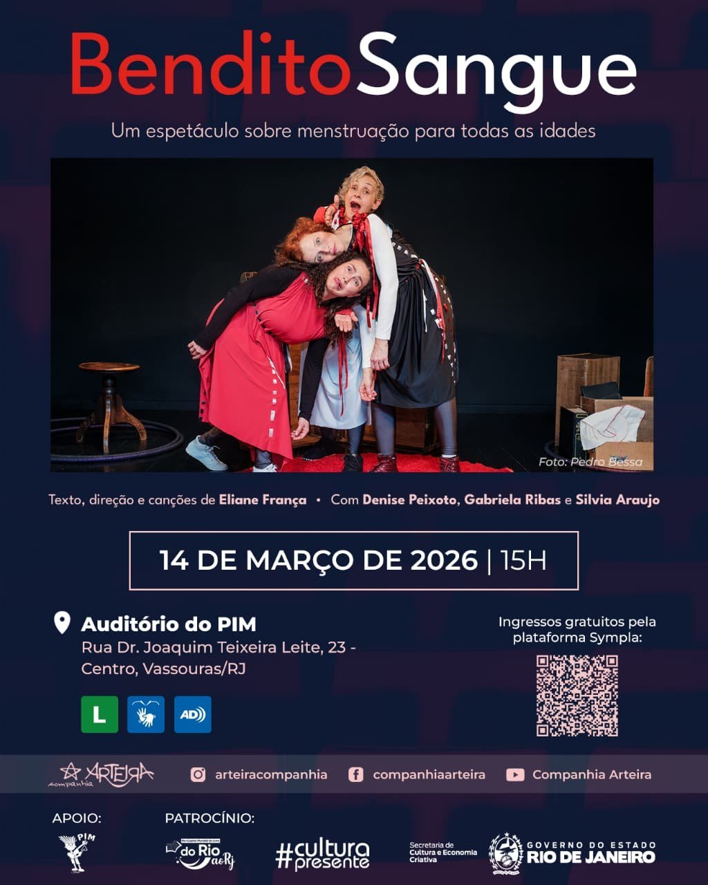Às 15h, apresenta o espetáculo “Bendito Sangue”, no Ponto de Cultura PIM, na Rua Dr. Joaquim Teixeira Leite, 23, Centro. Inscrições para a oficina e ingressos estão disponíveis nos links do Instagram @arteiracompanhia.