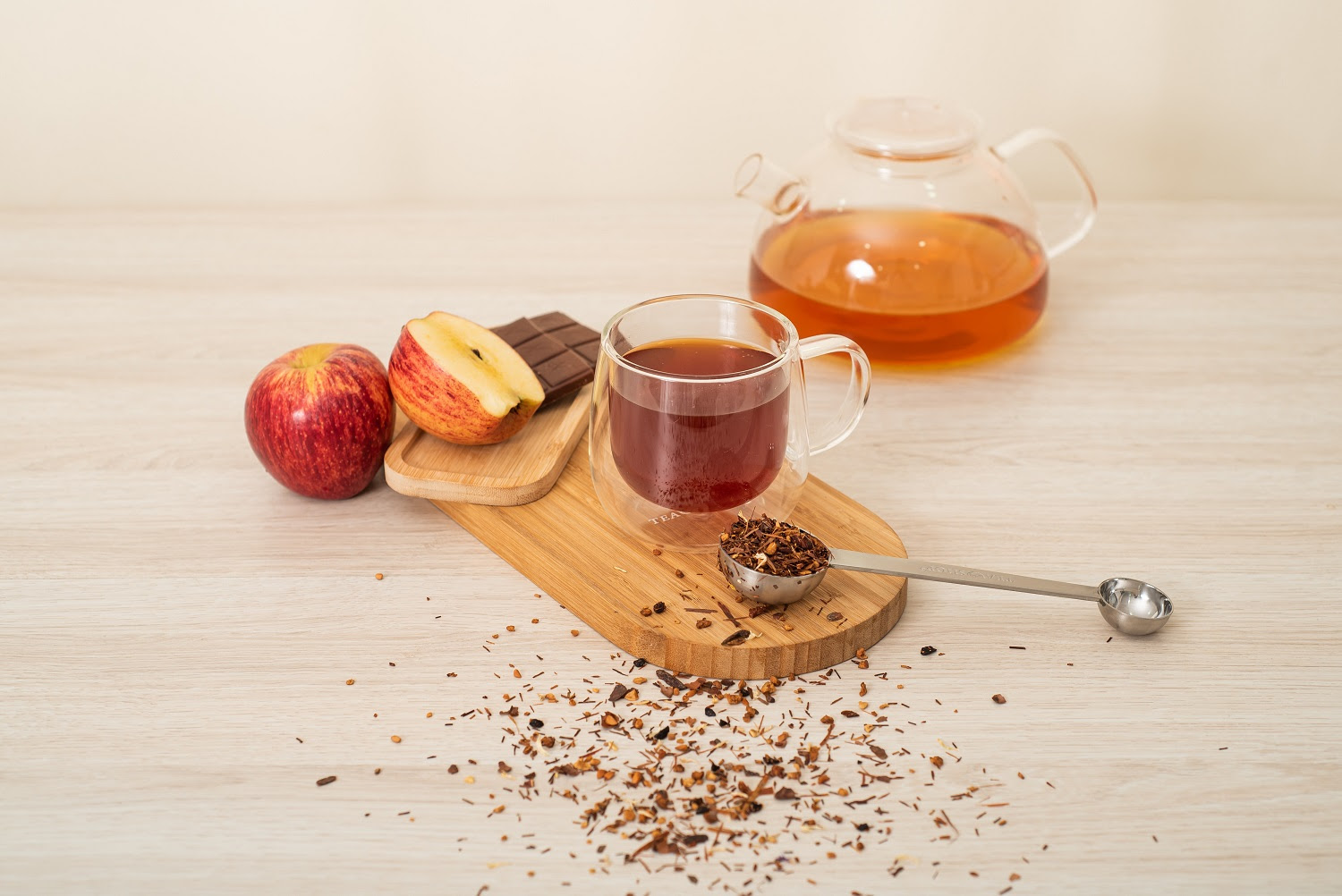Chá Vermelho Cinnamon Roll: Pu Erh, casca de cacau, maçã, canela, cacau, alfarroba, cúrcuma, rosa e calêndula. Toque intenso de rolinho de canela.