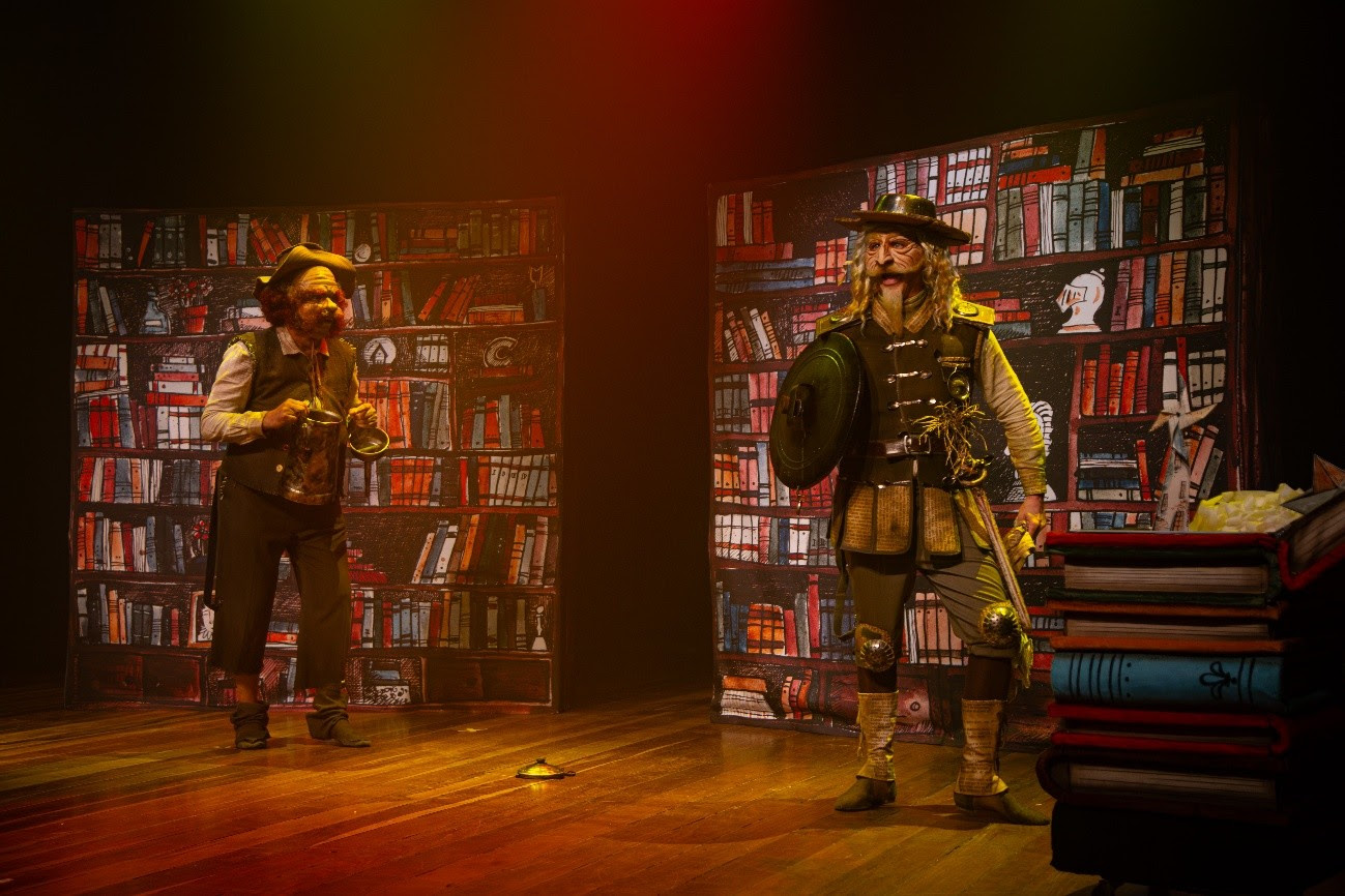 Dirigido e interpretado por Alvaro Assad (Dom Quixote) e Márcio Moura (Sancho Pança), o espetáculo transforma objetos cotidianos em personagens e cenários. Funis, bules, espanadores e tampas de lixo viram criaturas imaginárias, confundindo realidade e fantasia.