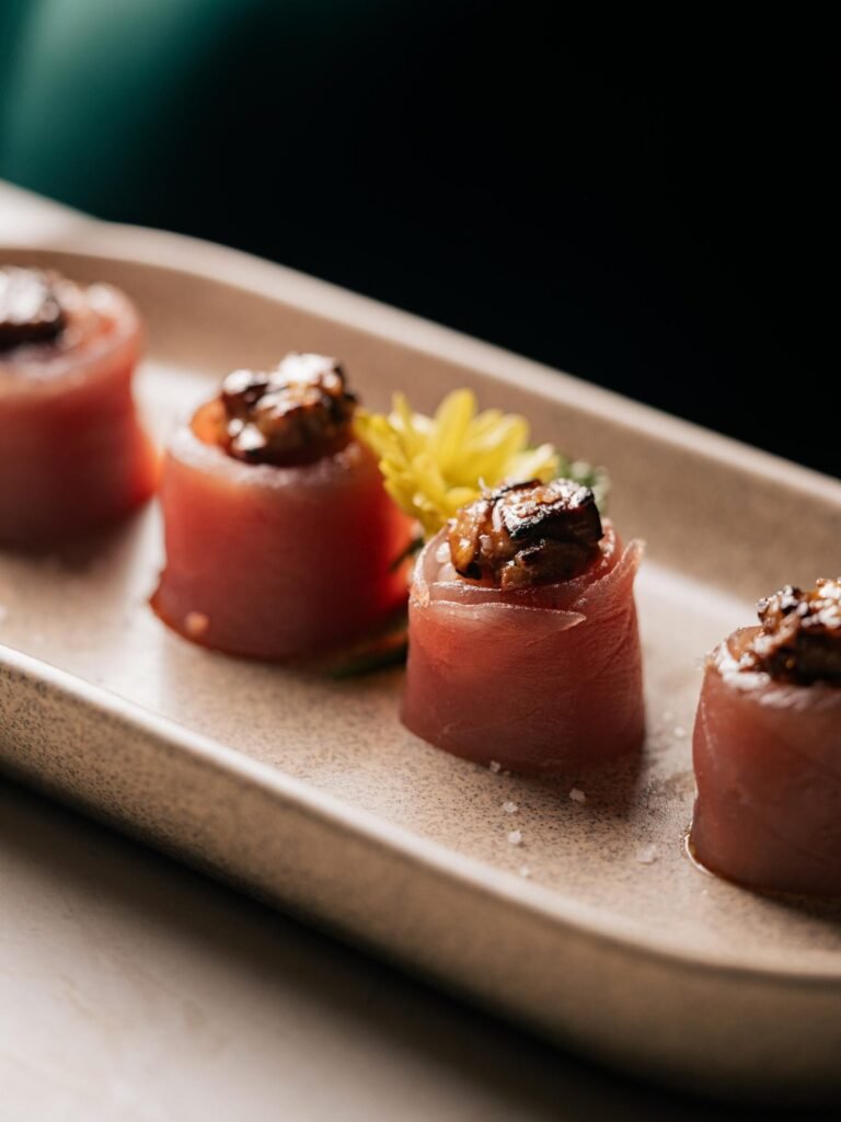 Entre os sushis, destacam-se o Sushi de Barriga de Salmão Trufada (R$ 66) e o Jo de Atum Foie Gras (R$ 98). Sashimis como Atum Tartufo (R$ 55/94) equilibram frescor e intensidade.