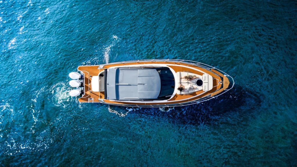 Hard top e espaço gourmet integram convés. Por outro lado, prioriza lazer prolongado.