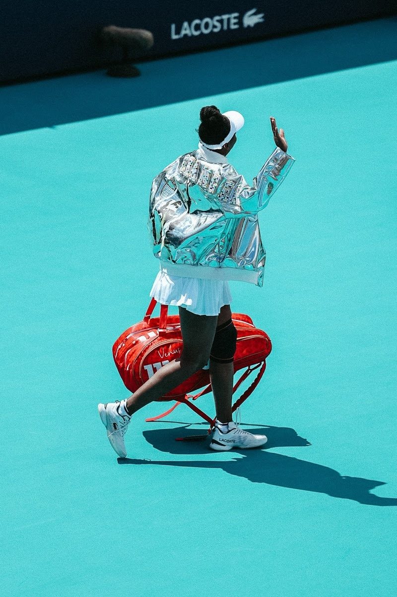 Venus Williams entra em quadra no Miami Open presented by Itaú. A embaixadora Lacoste veste jaqueta exclusiva batizada “Game Changer”. A criação homenageia sua influência no esporte.